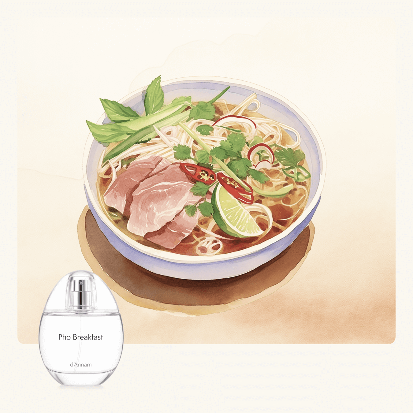 Pho Breakfast is inspired by pho, Vietnam's national dish. This fragrance mirrors the dish's main ingredients, echoes the warmth of spice blend, and weaves in hints of fresh herbs. While not a literal translation, Pho Breakfast invites you to savour its symphony of aromas and tastes.
